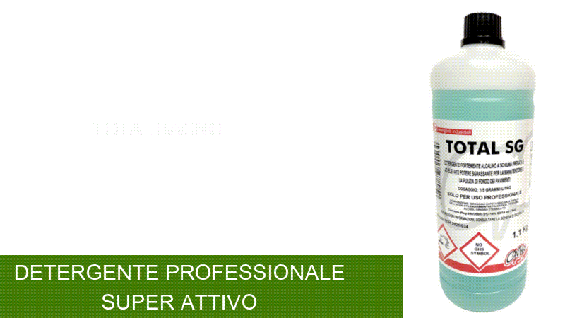 TOTAL SG. Detersivo super sgrassante adatto per tutte le superfici lavabili. Elimina senza fatica lo sporco di difficile anche se vecchio e fissato. Idoneo anche per piani HACCP. I sui utilizzi possono essere innumerevoli ed in vari ambienti vi invitiamo a consultare la scheda tecnica per scoprire a pieno le sue funzionalità.
